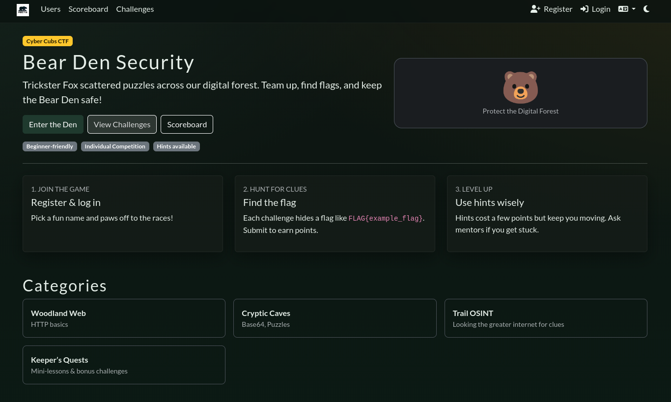 And believe it or not that is it! Our site is now setup with the default CTFd interface.